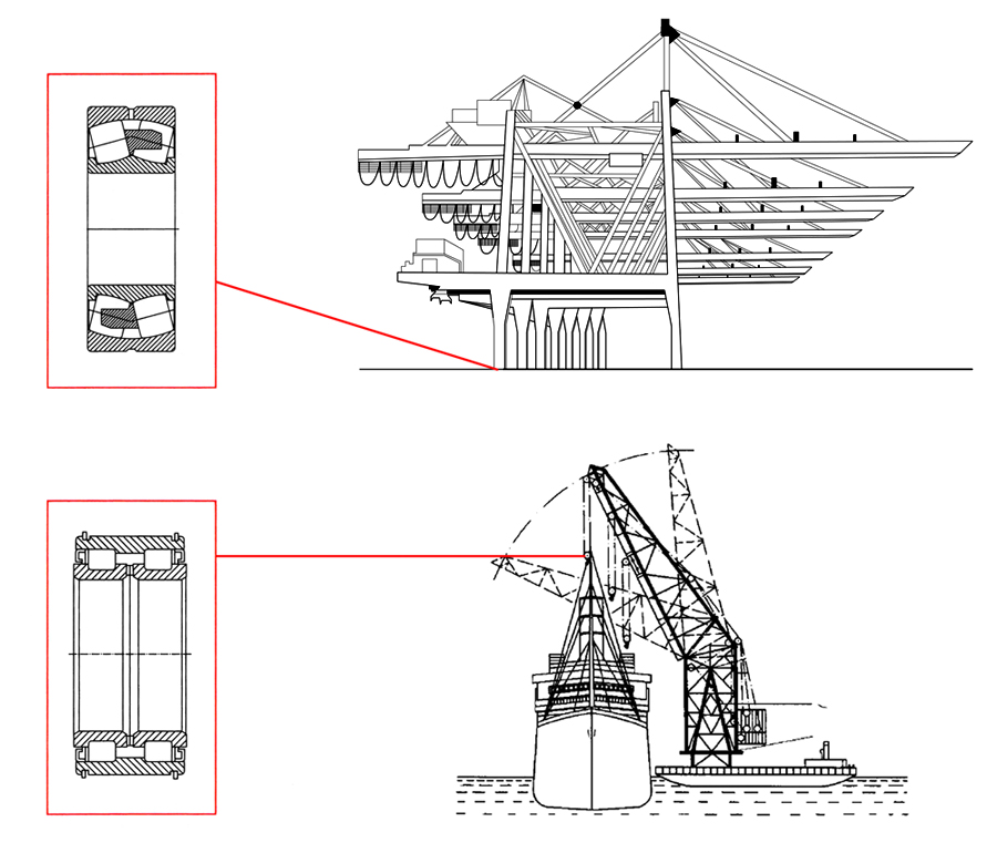 起重運輸機械的工作特點是間歇性運動,各機械經常處于啟動、制動和正反向運轉的工作狀態,其運行速度雖然不高,但經常承載重載,且長期在粉塵或海水潮濕腐蝕等惡劣環境下連續工作,要求設備必須具有高效、連續、穩定、可靠、易維護和長壽命等特點,相應對配套軸承提出低速、重載、高可靠性及長壽命的要求。目前軸承主要應用于齒輪箱、行走機構、起升機構、變幅機構、回轉機構等。